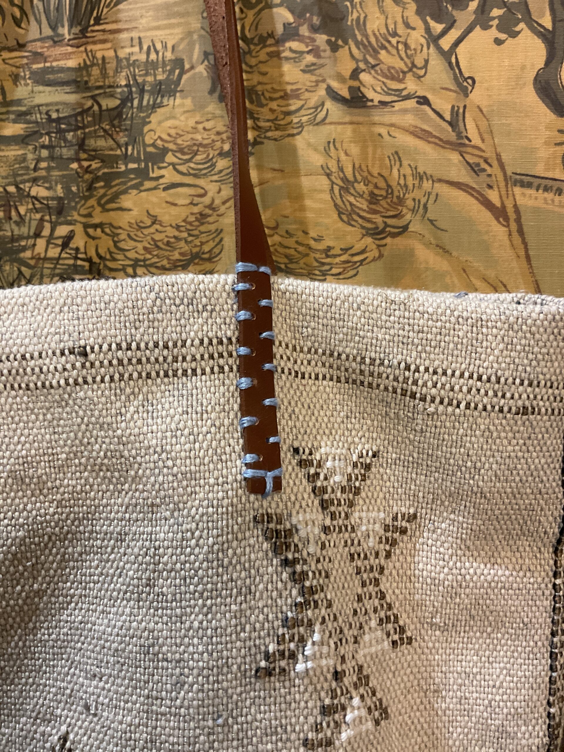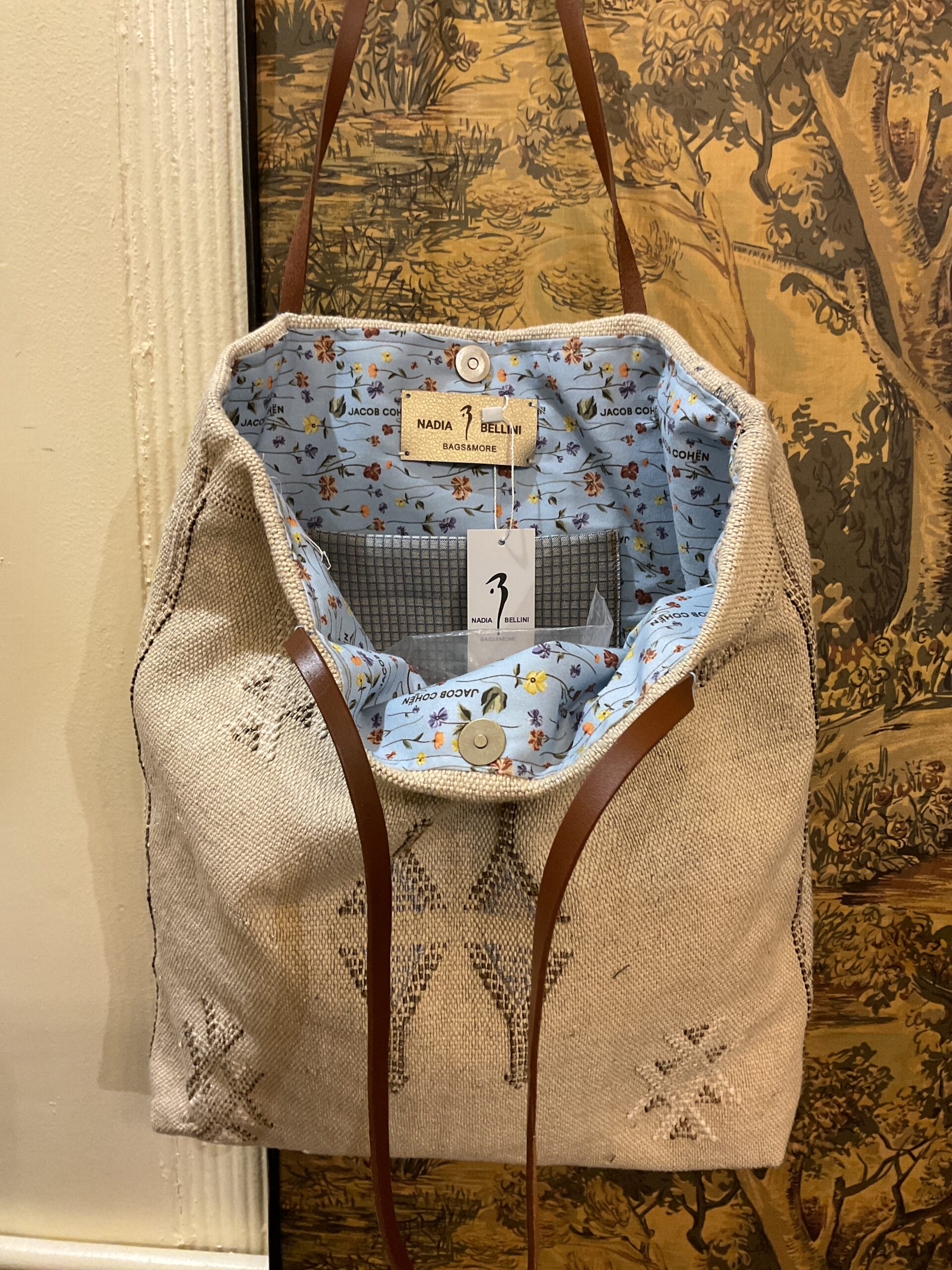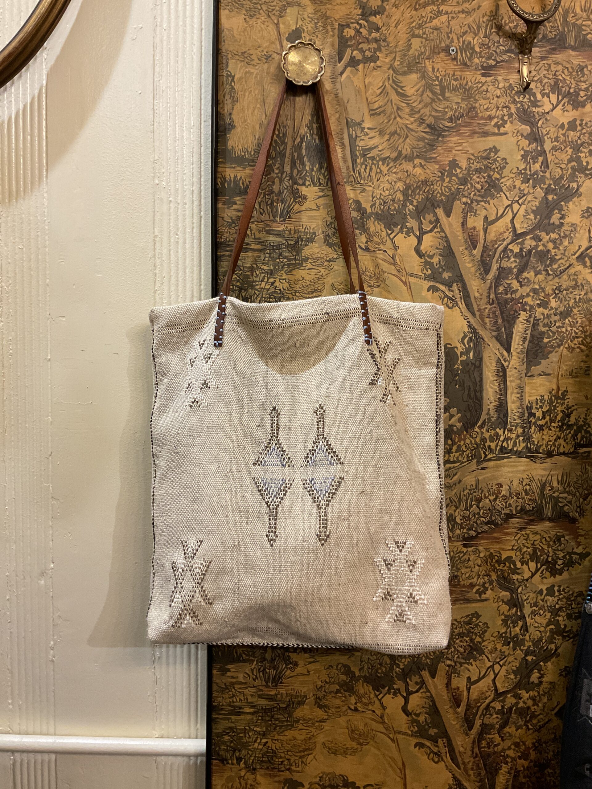 Shopper realizzata con cuscini tribali in cotone e seta di cactus. Manici in pelle rifiniti a mano con cuciture in cotone