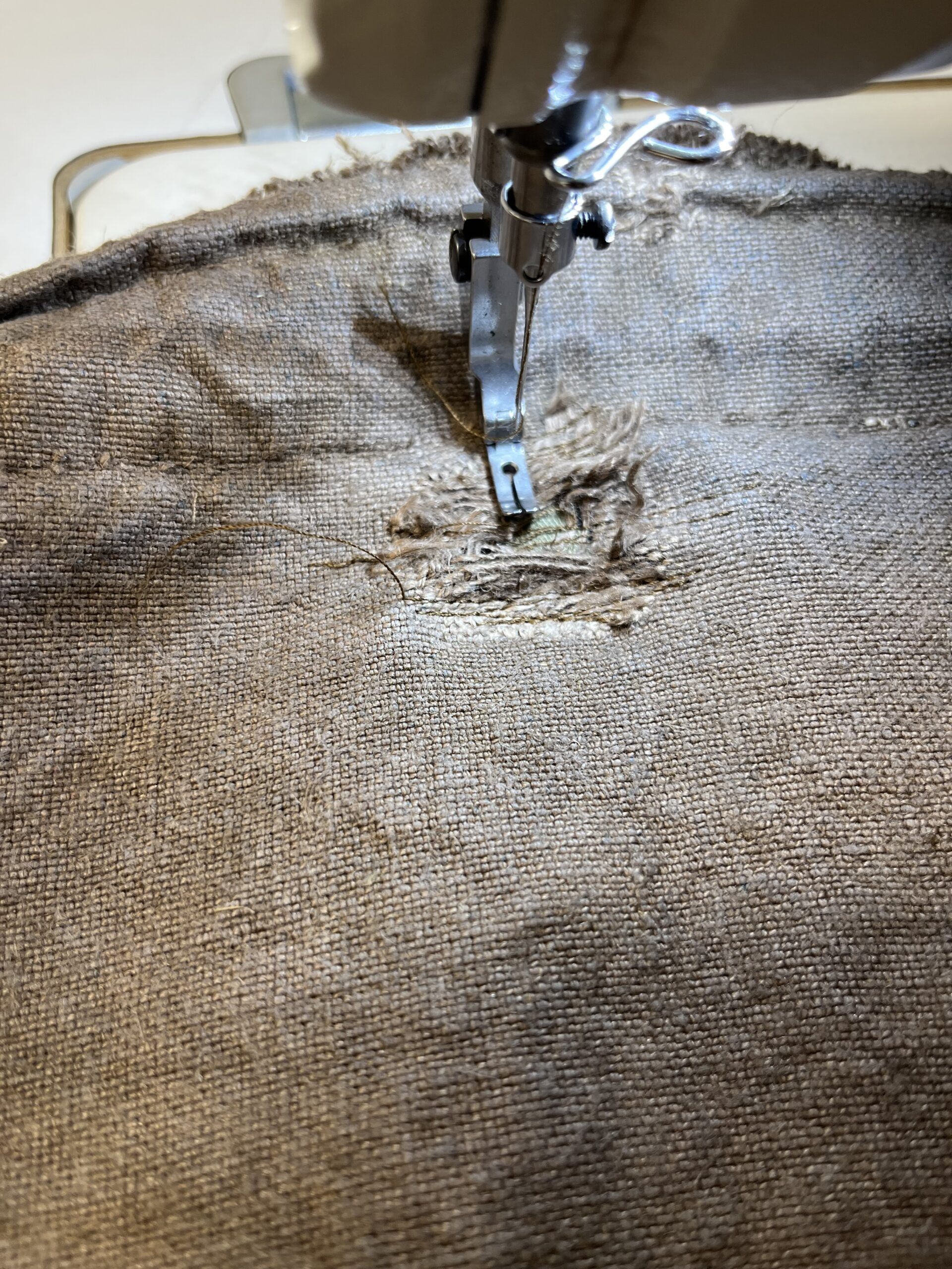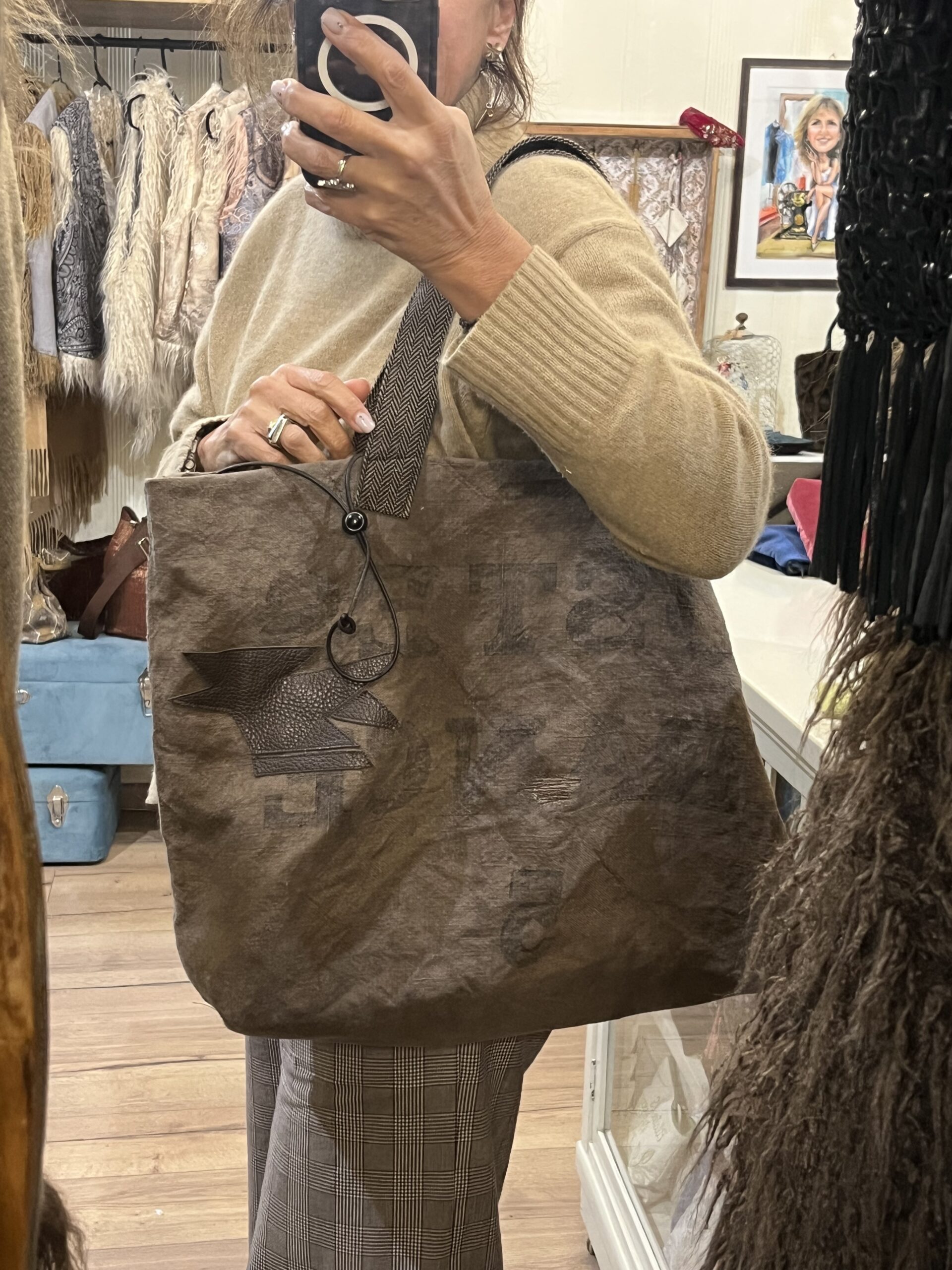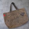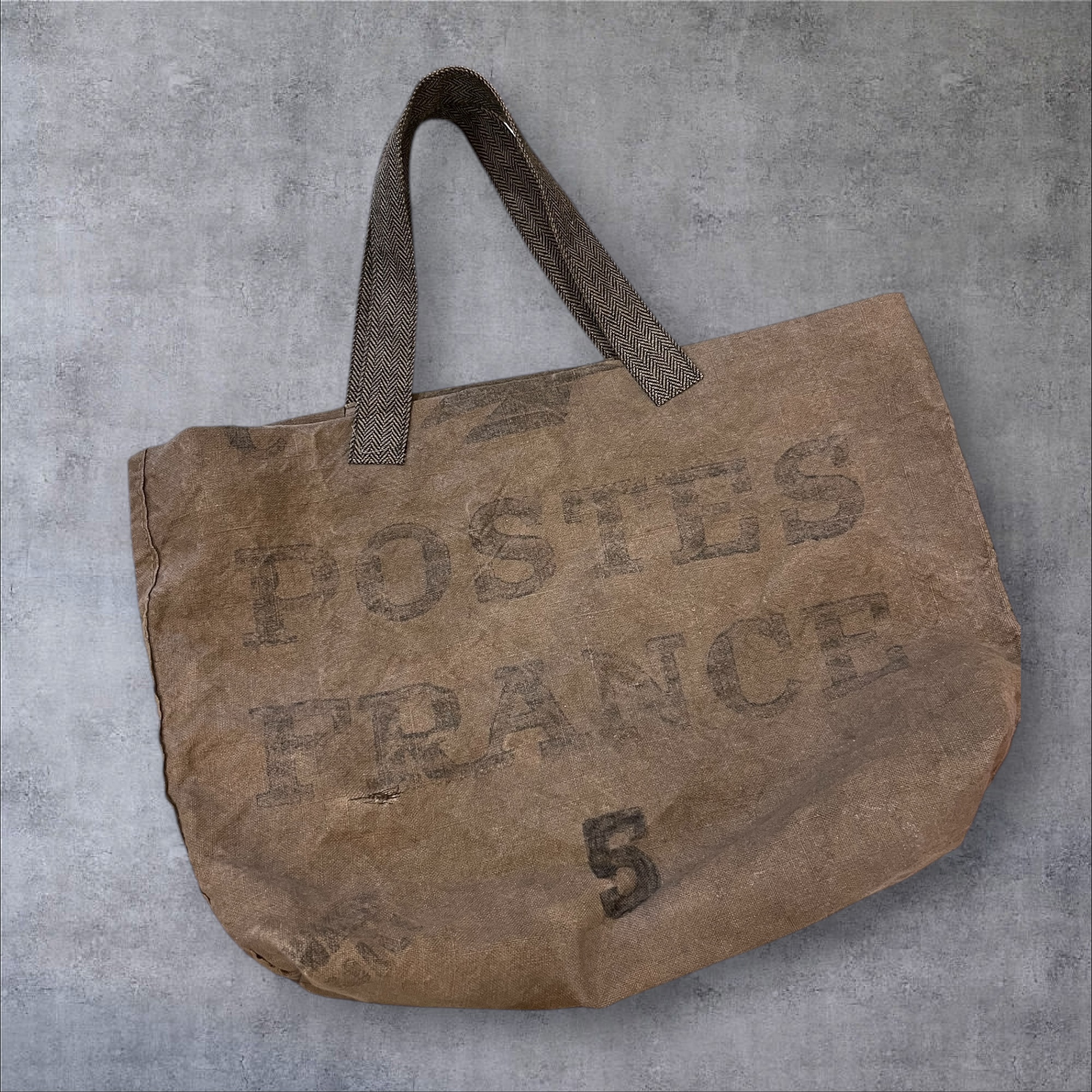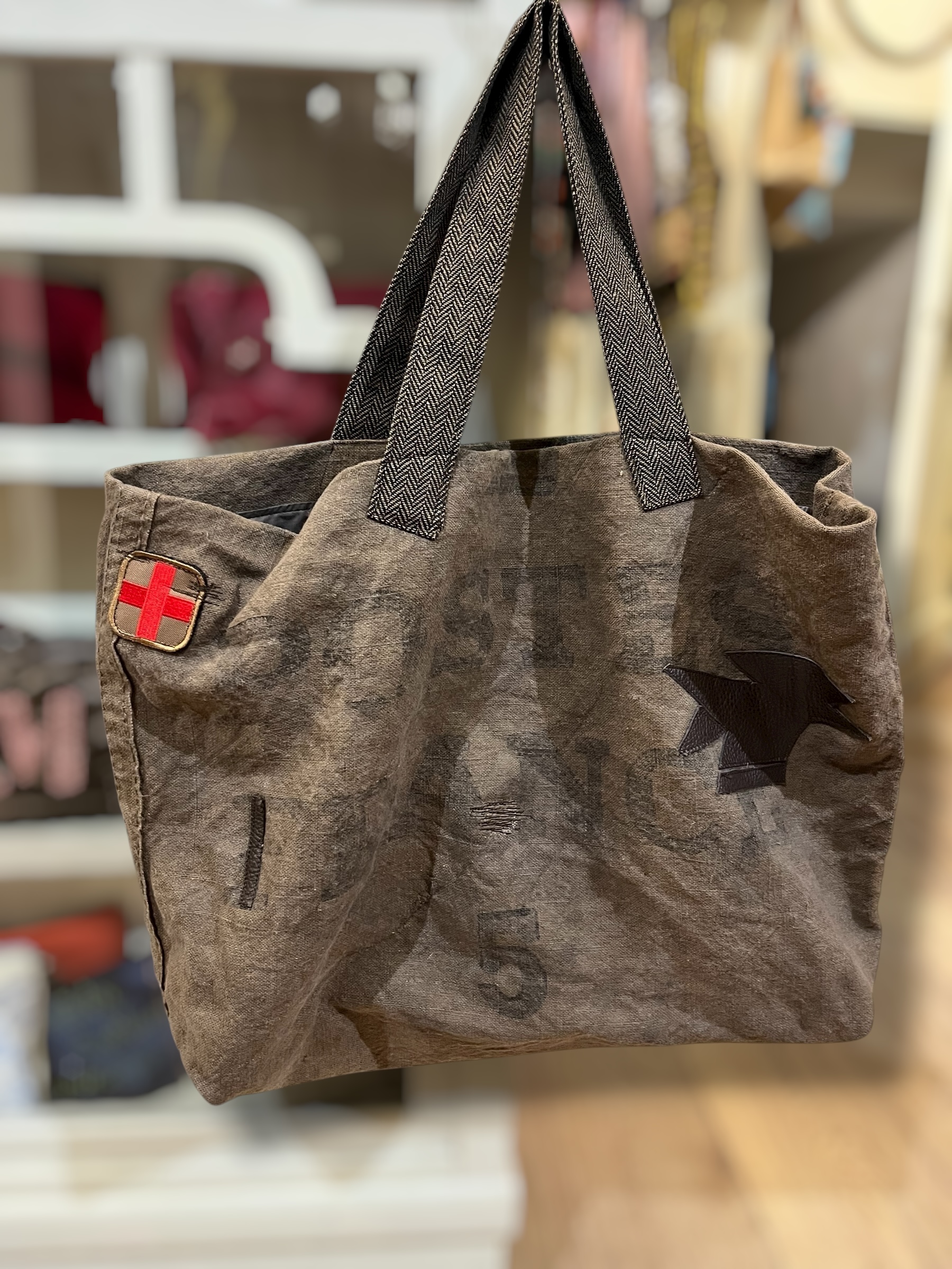 Borsa a spalla unica, realizzata a partire da un autentico sacco delle poste francesi. Il tessuto originale è stato ritinto color cioccolato , arricchito con applicazioni patch e ricamo di pelle, che ne valorizzano il carattere materico e autentico.
