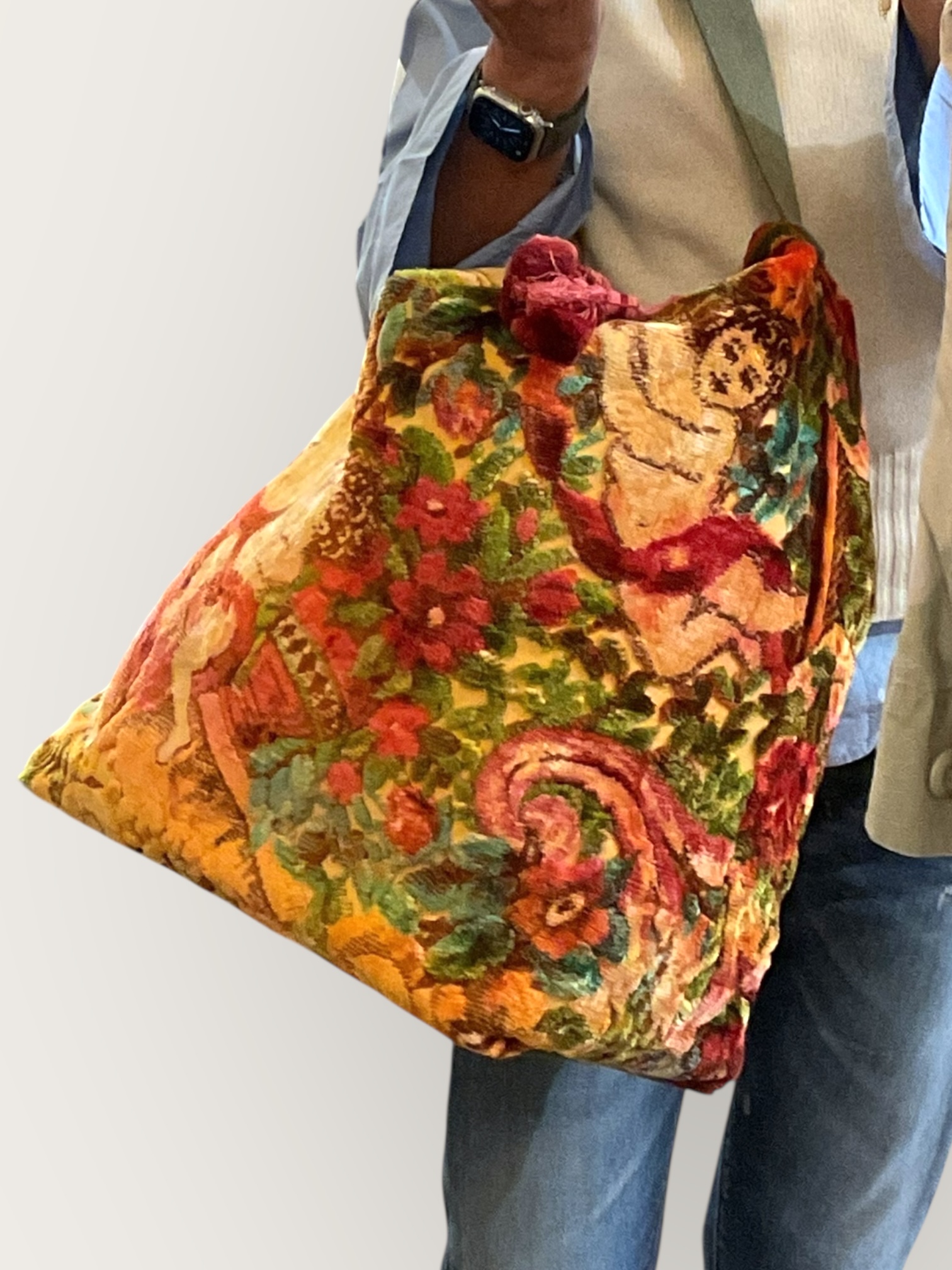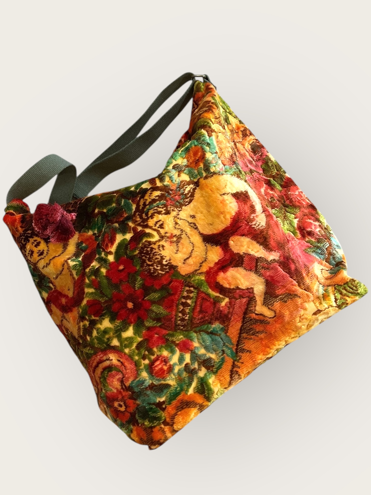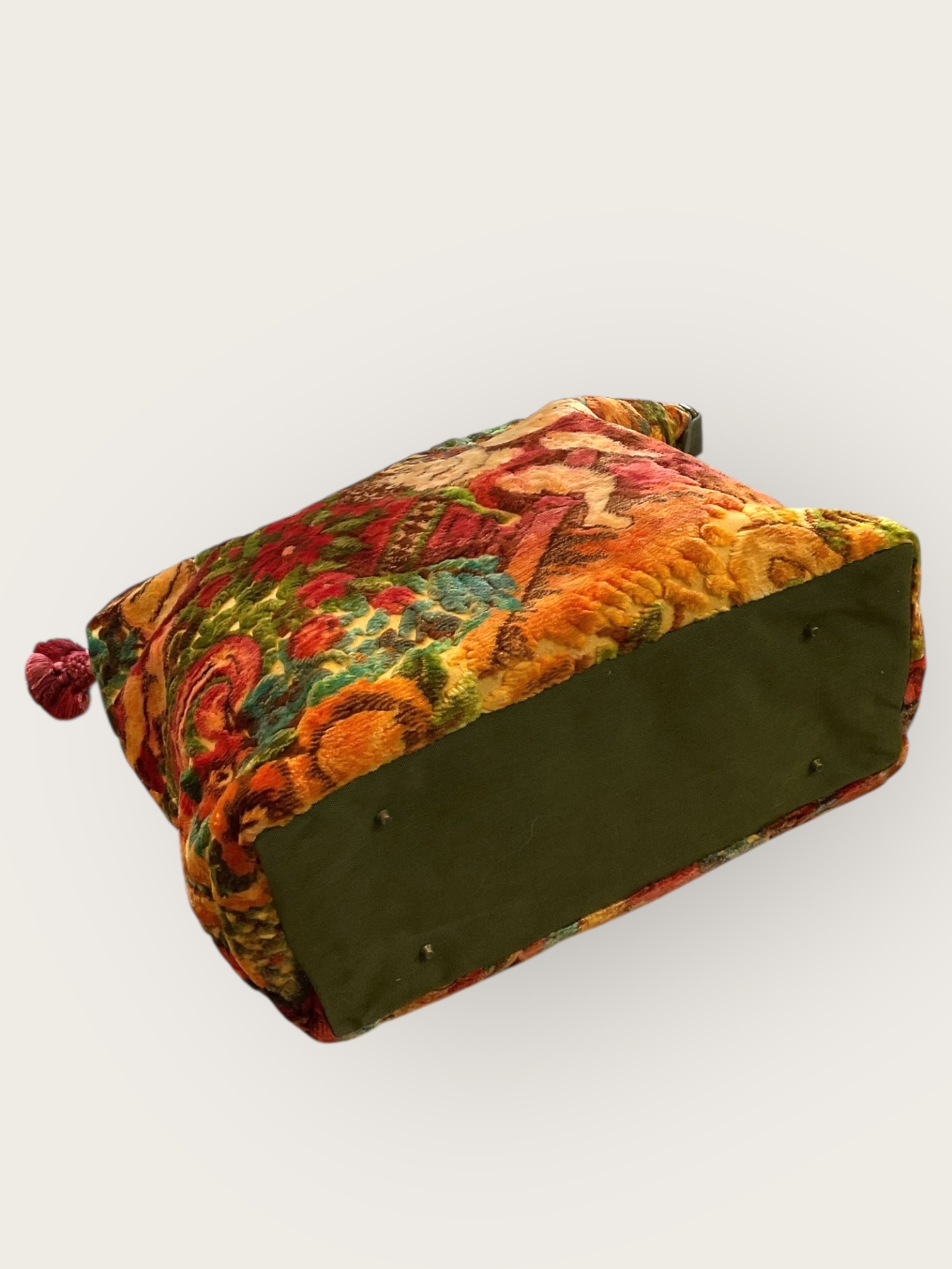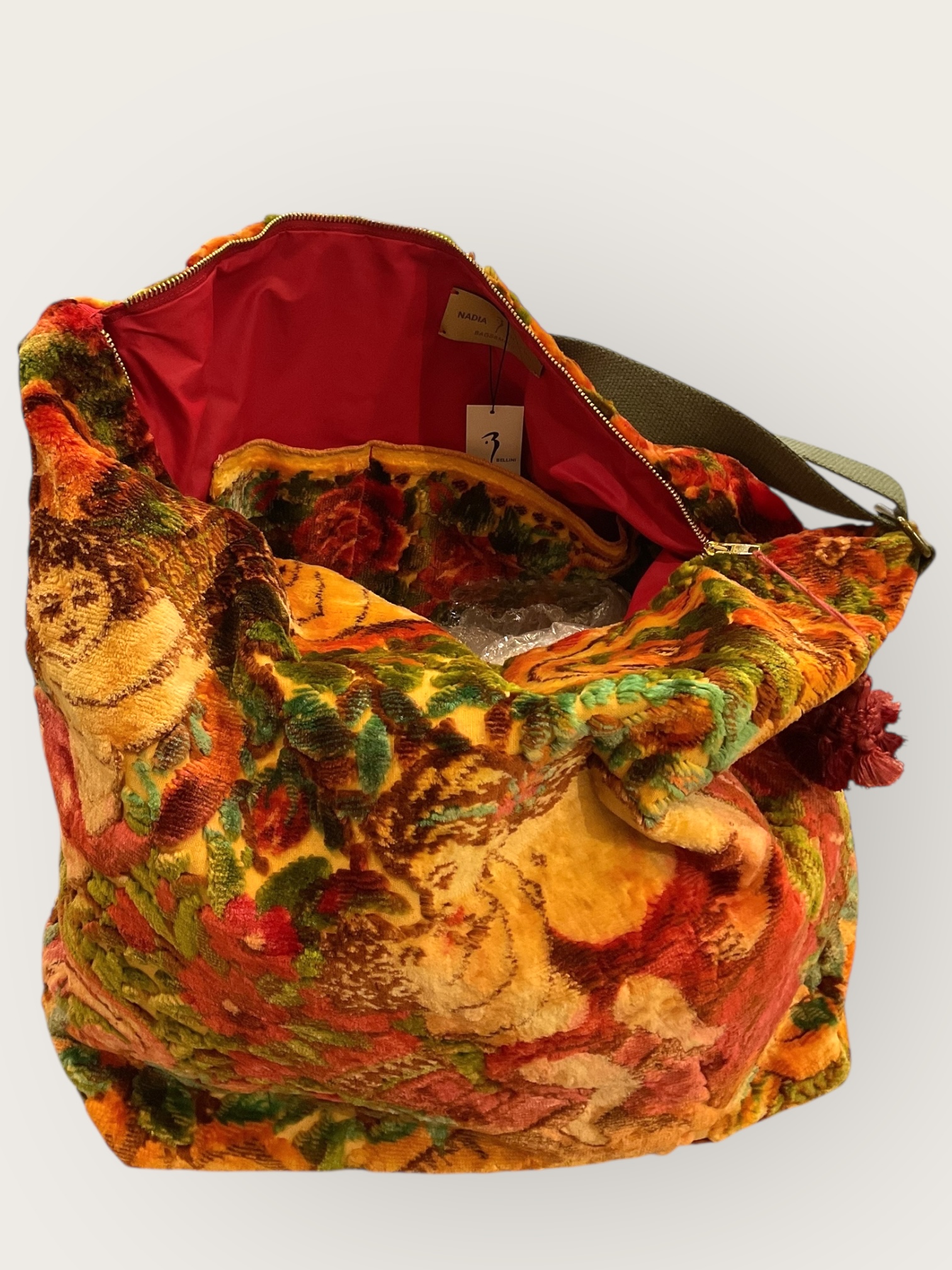 Maxi bag ideale per week end! Originale borsone realizzato con copriletto anni ‘70 e base in resistente tela militare con piedini.
