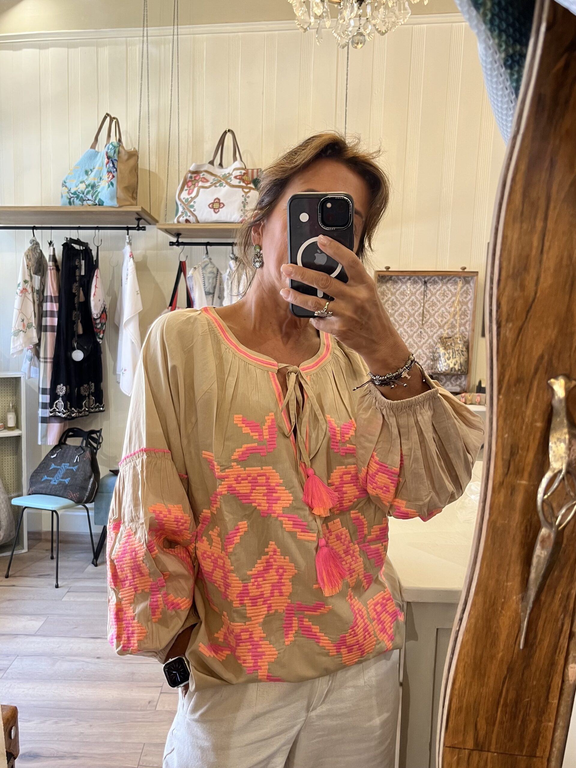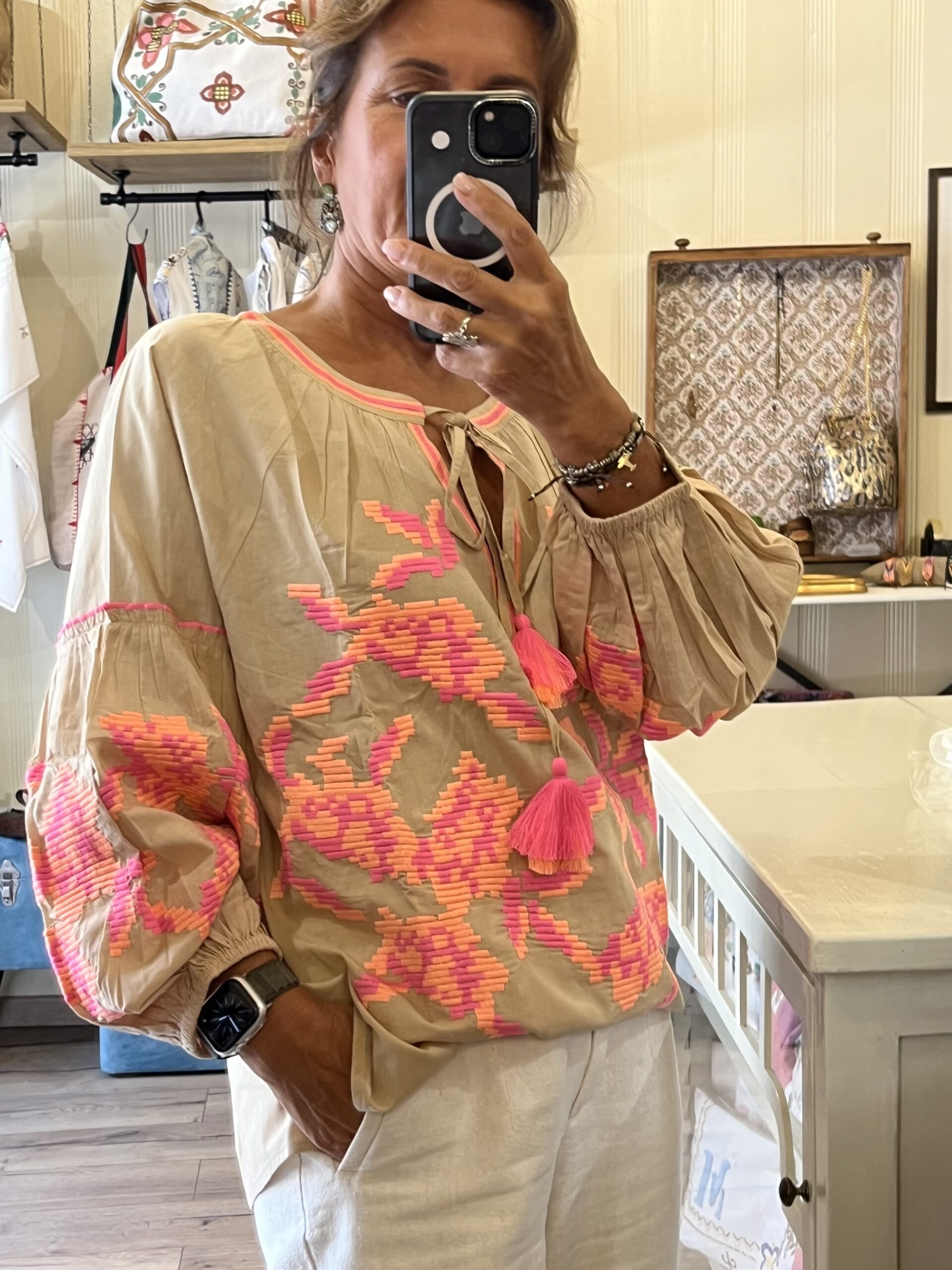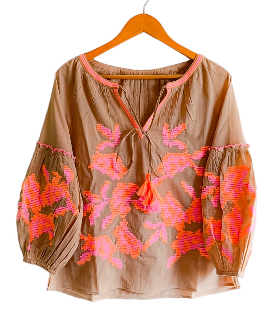 Realizzata in morbida mussola di cotone traspirante, questa camicetta unisce comfort e raffinatezza. Il delicato ricamo impreziosisce il tessuto leggero, conferendo un tocco romantico e femminile. Le maniche a baloon aggiungono volume e movimento, creando una silhouette sofisticata. Perfetta da indossare sia con un jeans casual che con un pantalone elegante, è un capo versatile per ogni occasione.