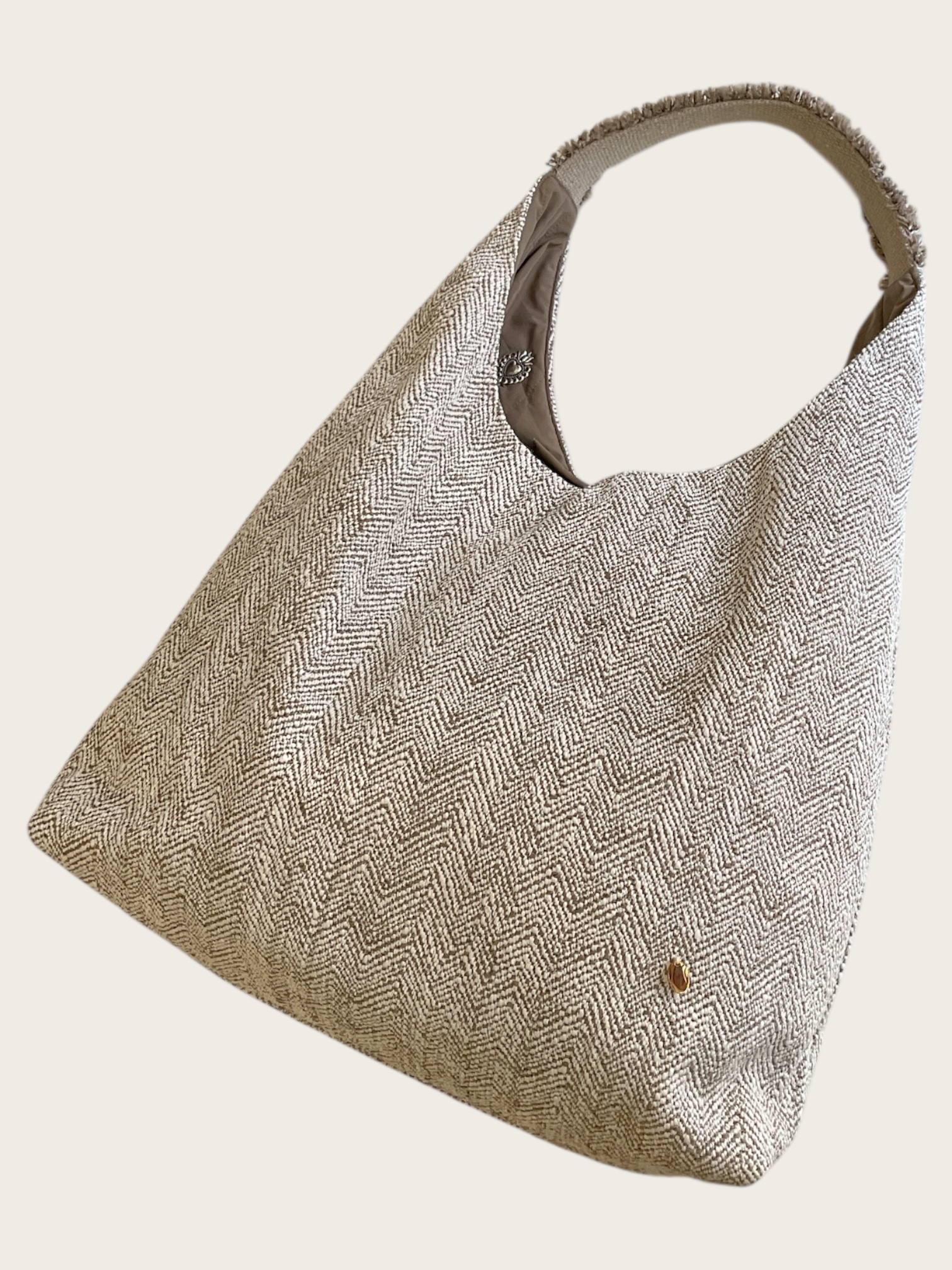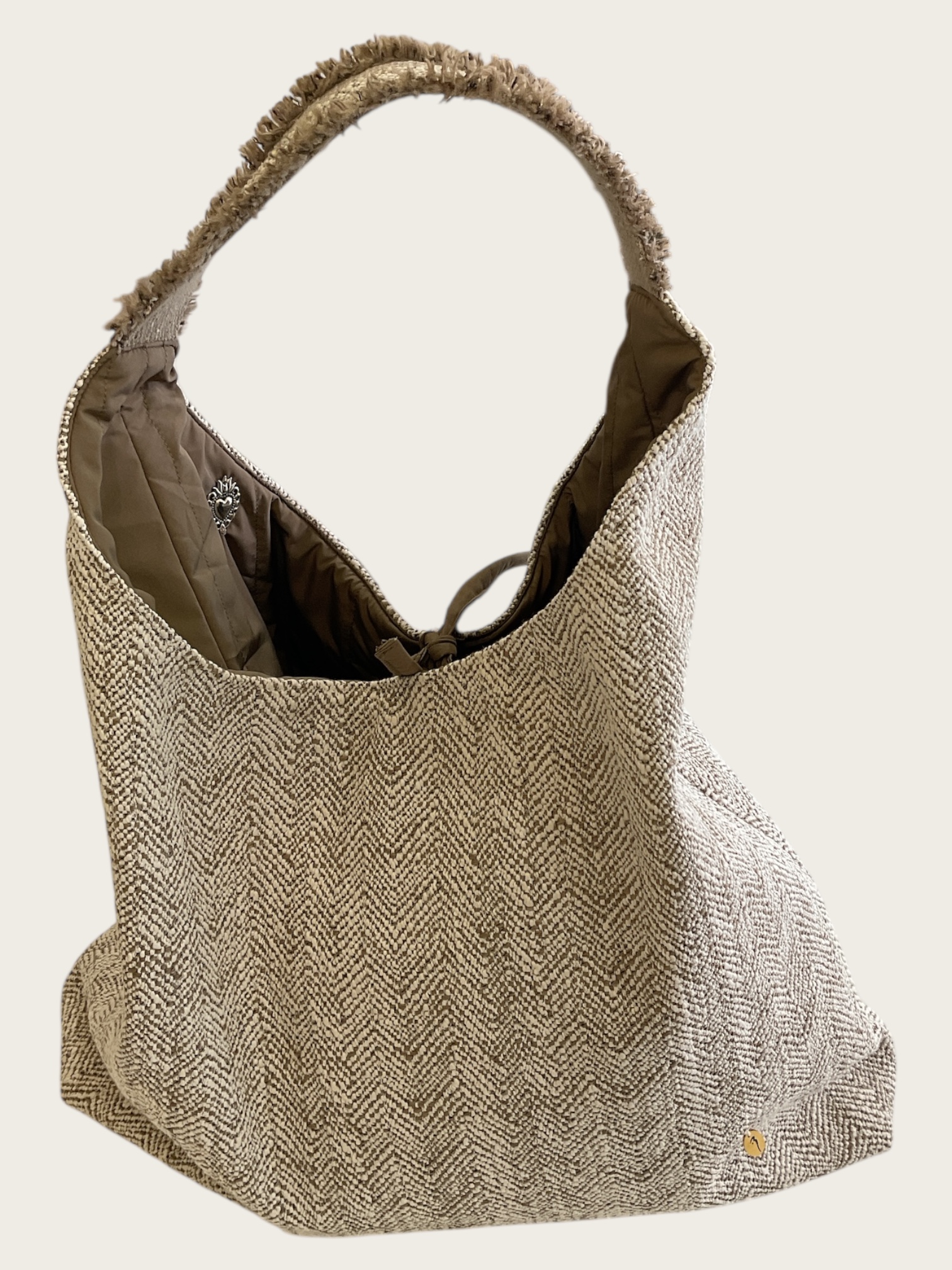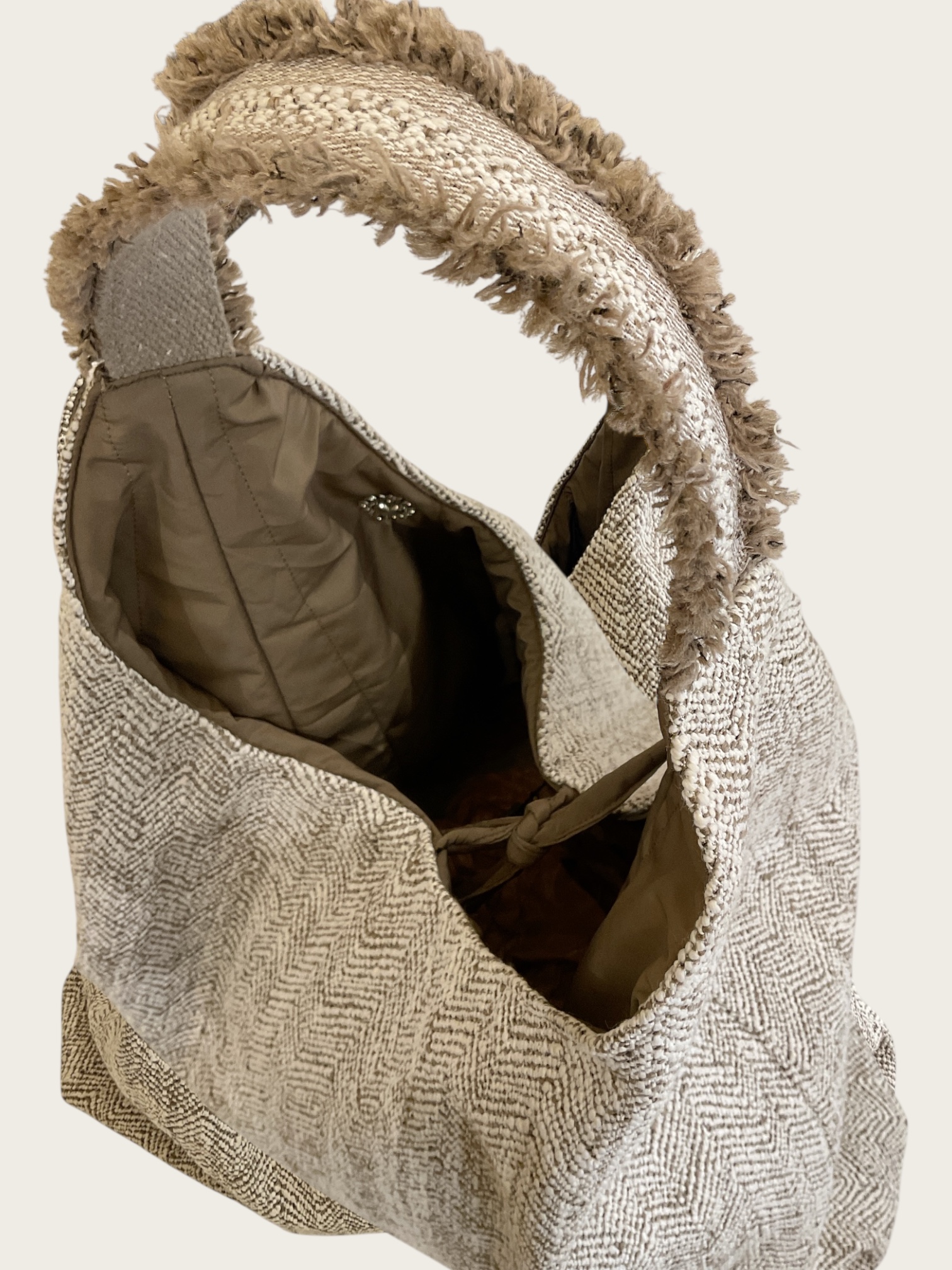 Morbida sacca a spalla foderata con leggero tessuto trapuntato color taupe