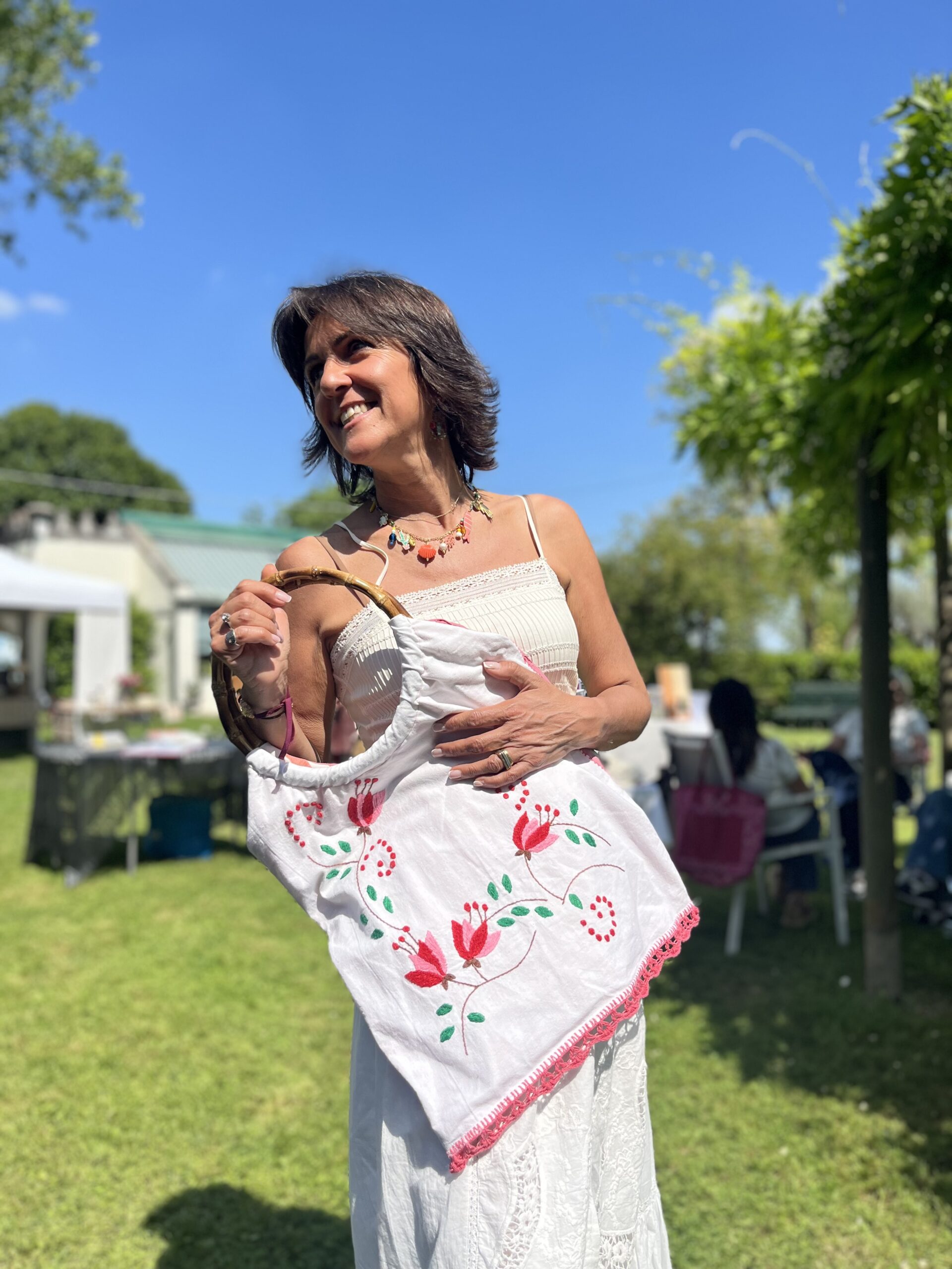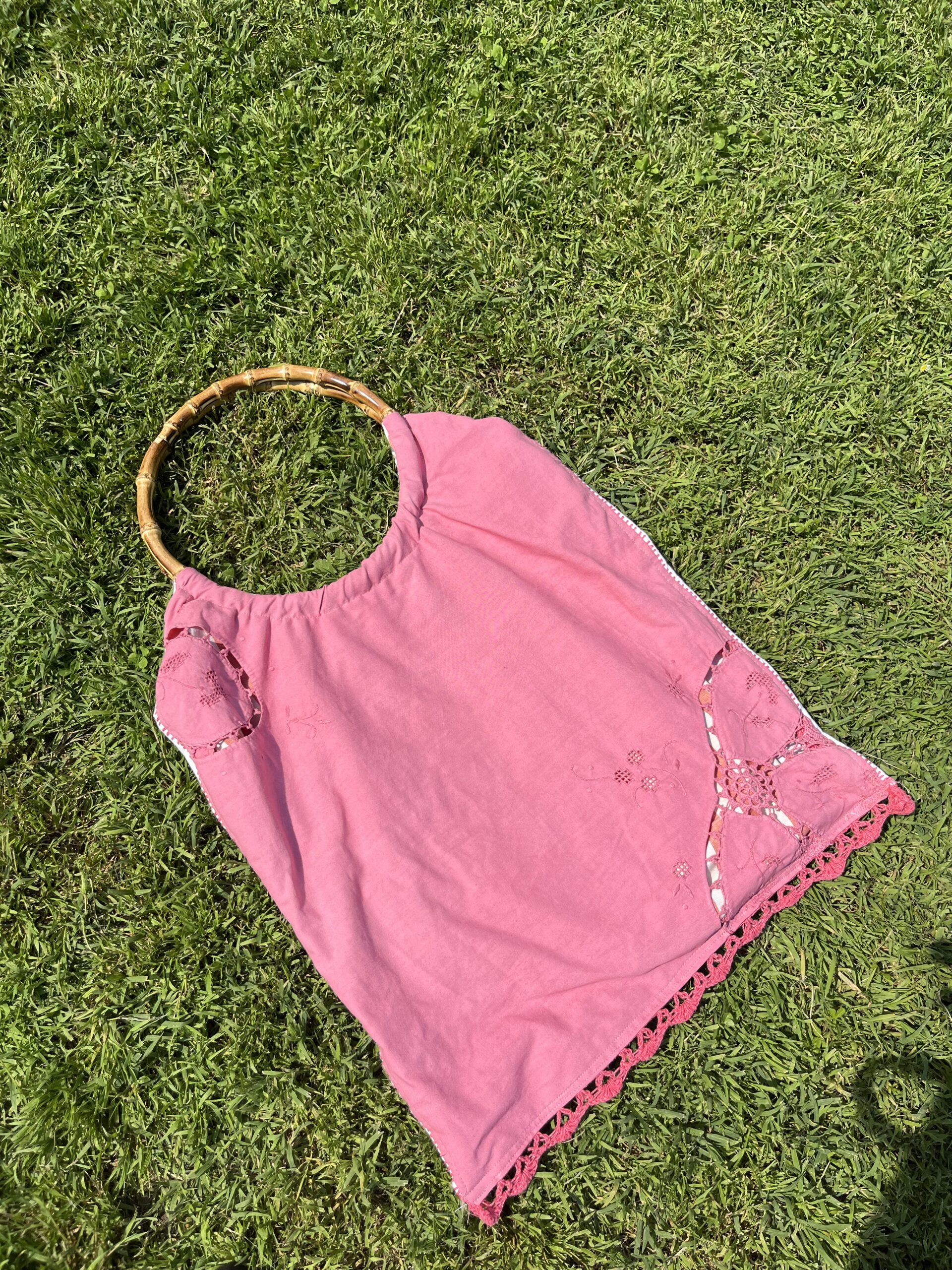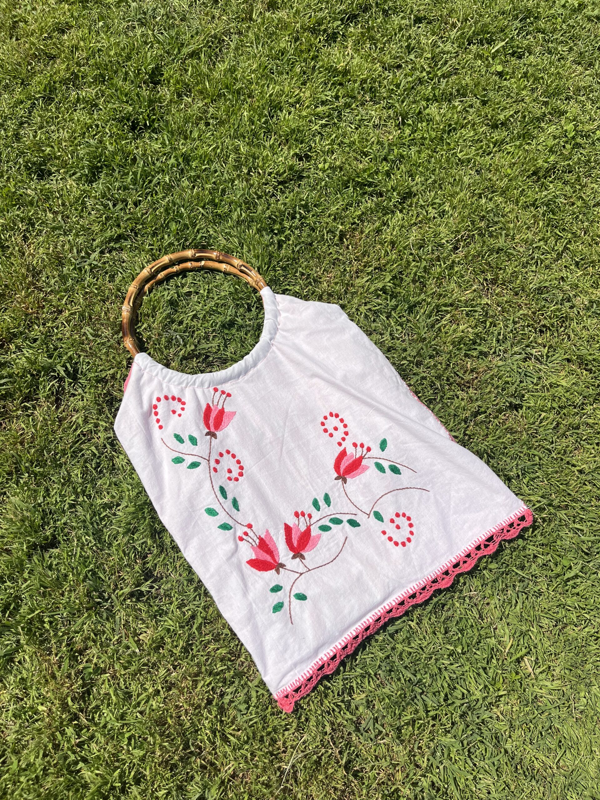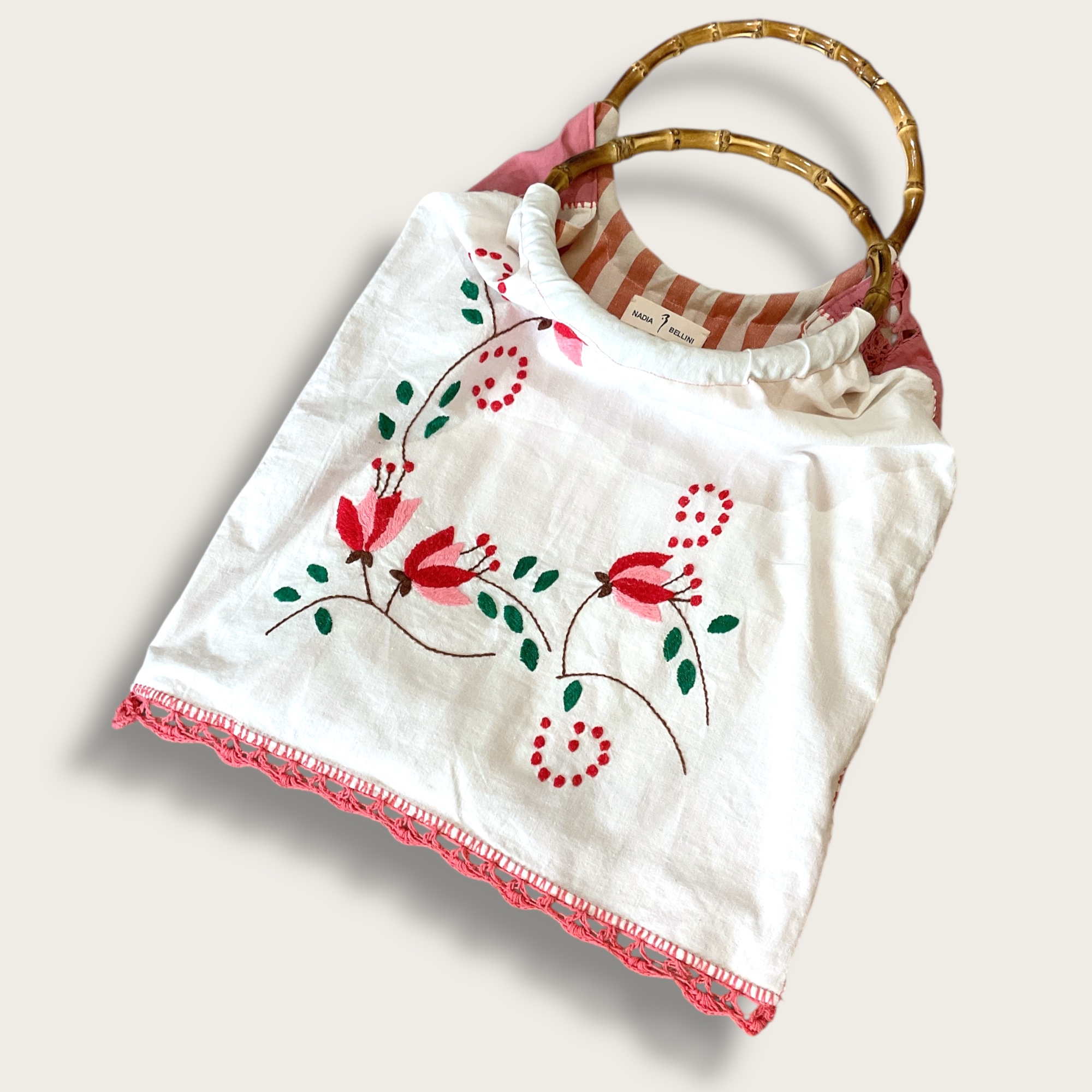 Borsa frutto di Upcycling creativo e realizzata con tovagliame antico finemente ricamato a mano. Foderata in resistente cotone e con tasca ricamata interna. Manico in bamboo.