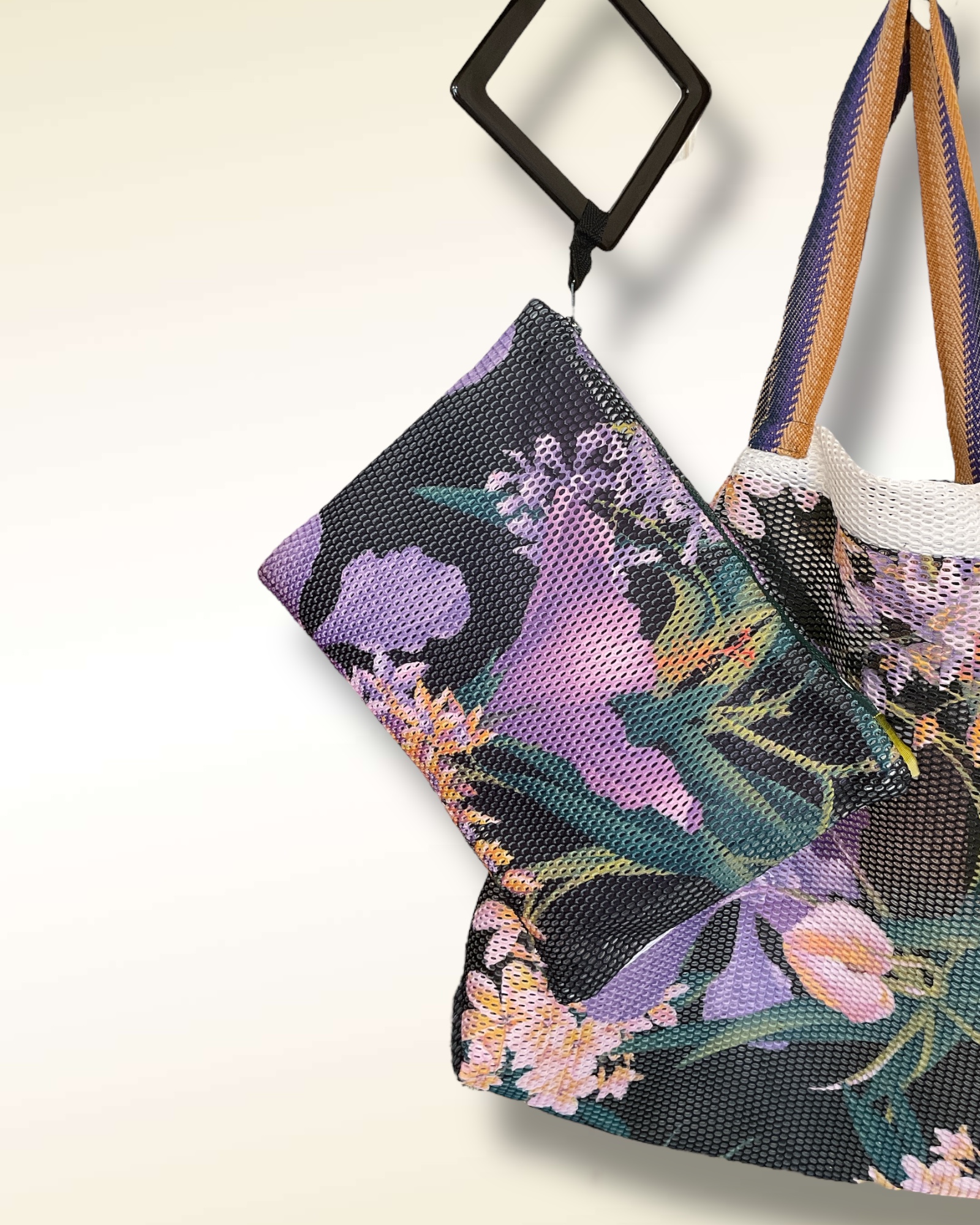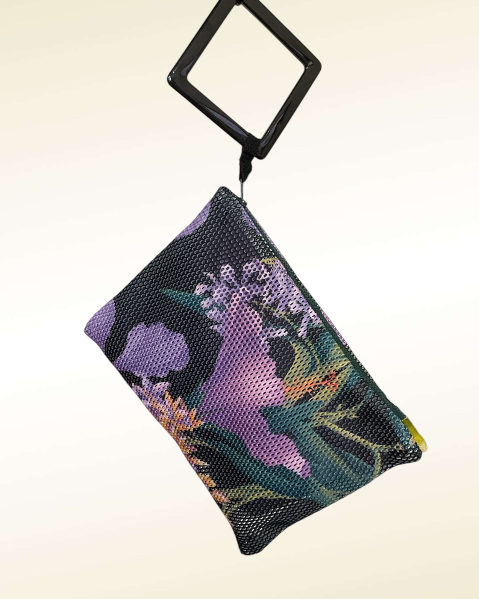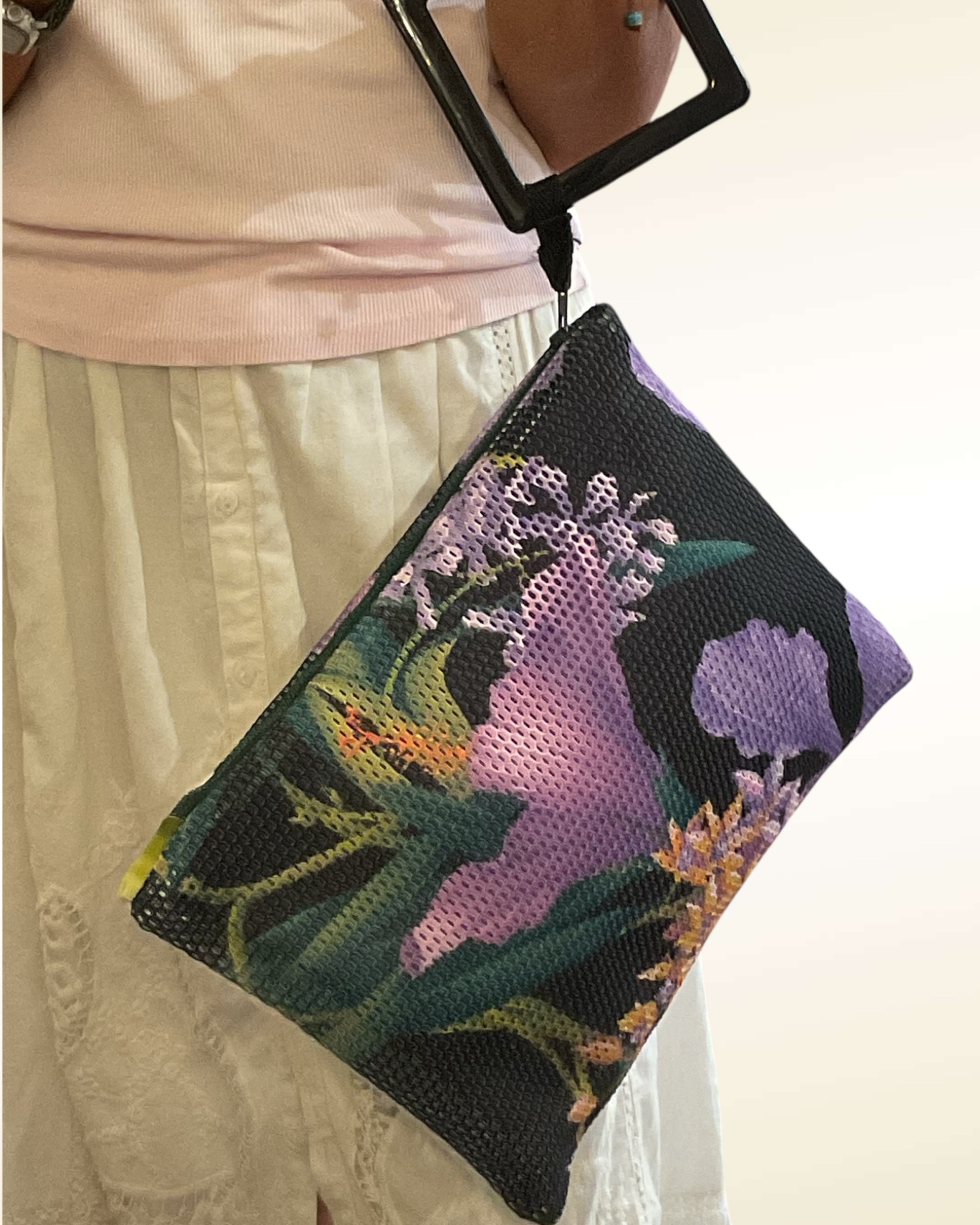 Originale Pochettona realizzata con una rete stampata con maxi fiori e manico in resina nera da portare a polso o a mano