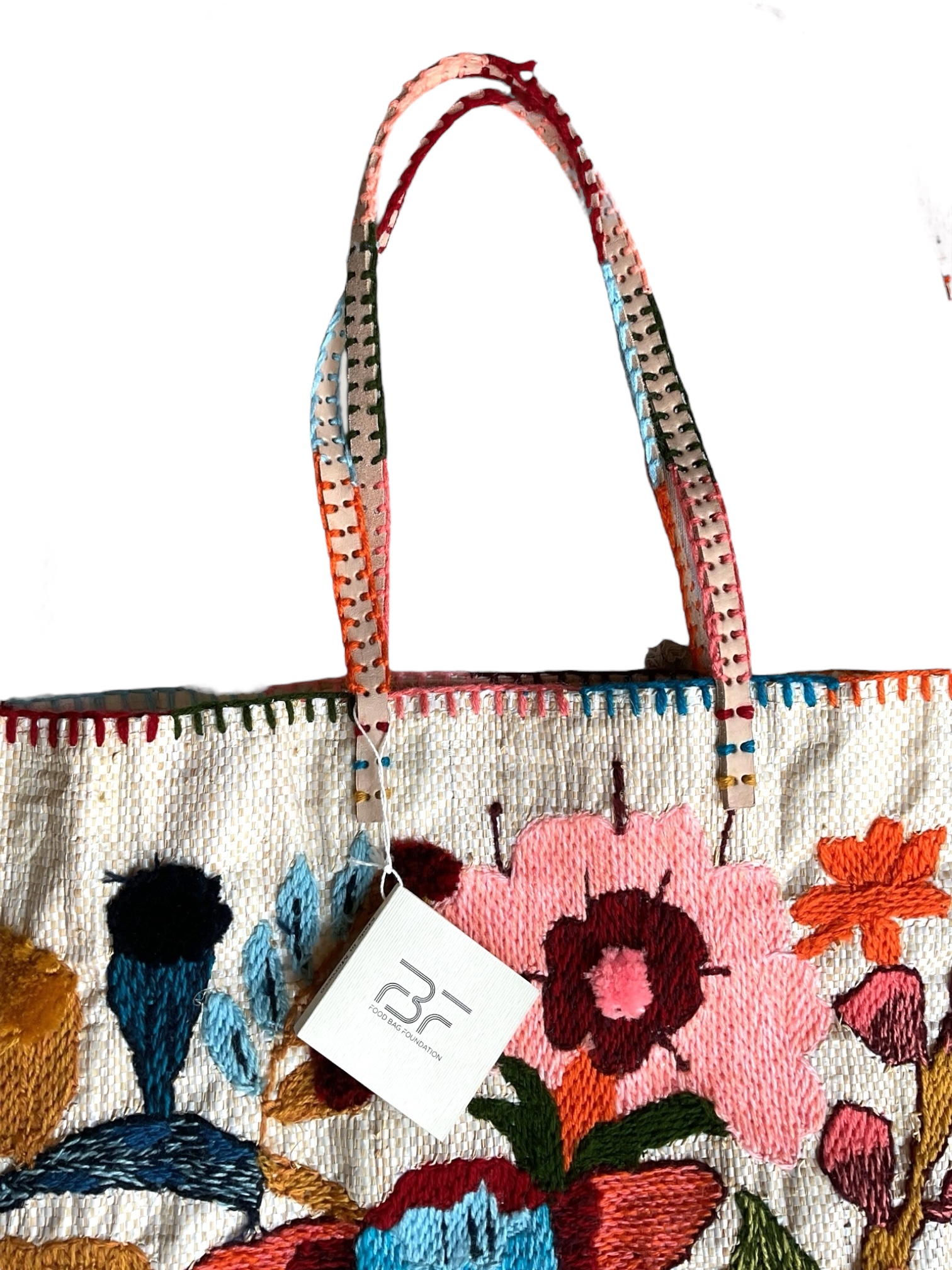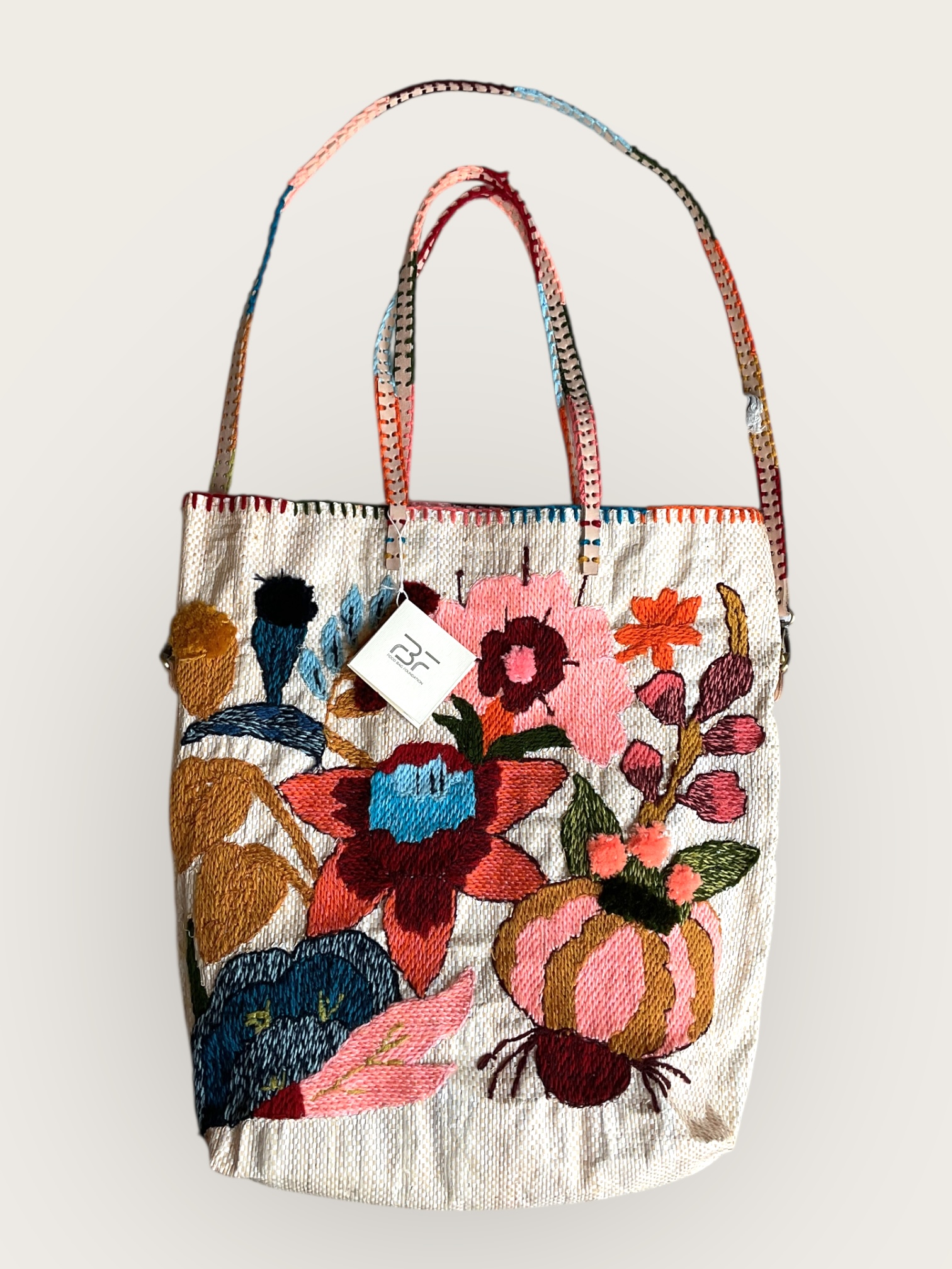 Borsa ricavata da sacco di farina da 25 kg totalmente ricamata a mano con motivi floreali.